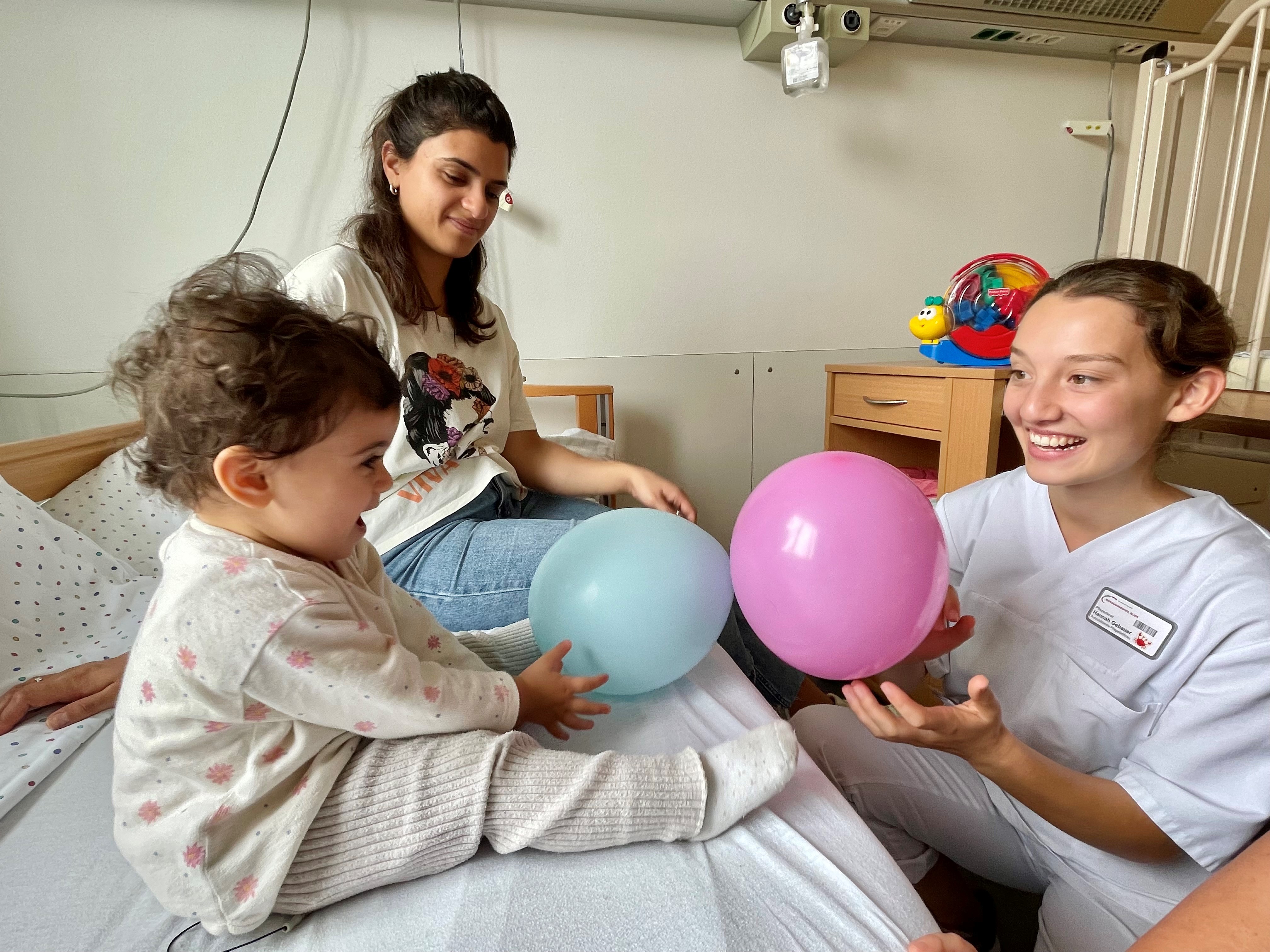 Foto: Die Auszubildende Hannah Gebauer motiviert die 17 Monate alte Derin, sich zu bewegen. Das kleine Mädchen hatte eine schwere Bronchitis. Die Mobilisation im Spiel und jedes Pusten in Richtung Ballon macht Derins Bronchien frei von Sekreten.