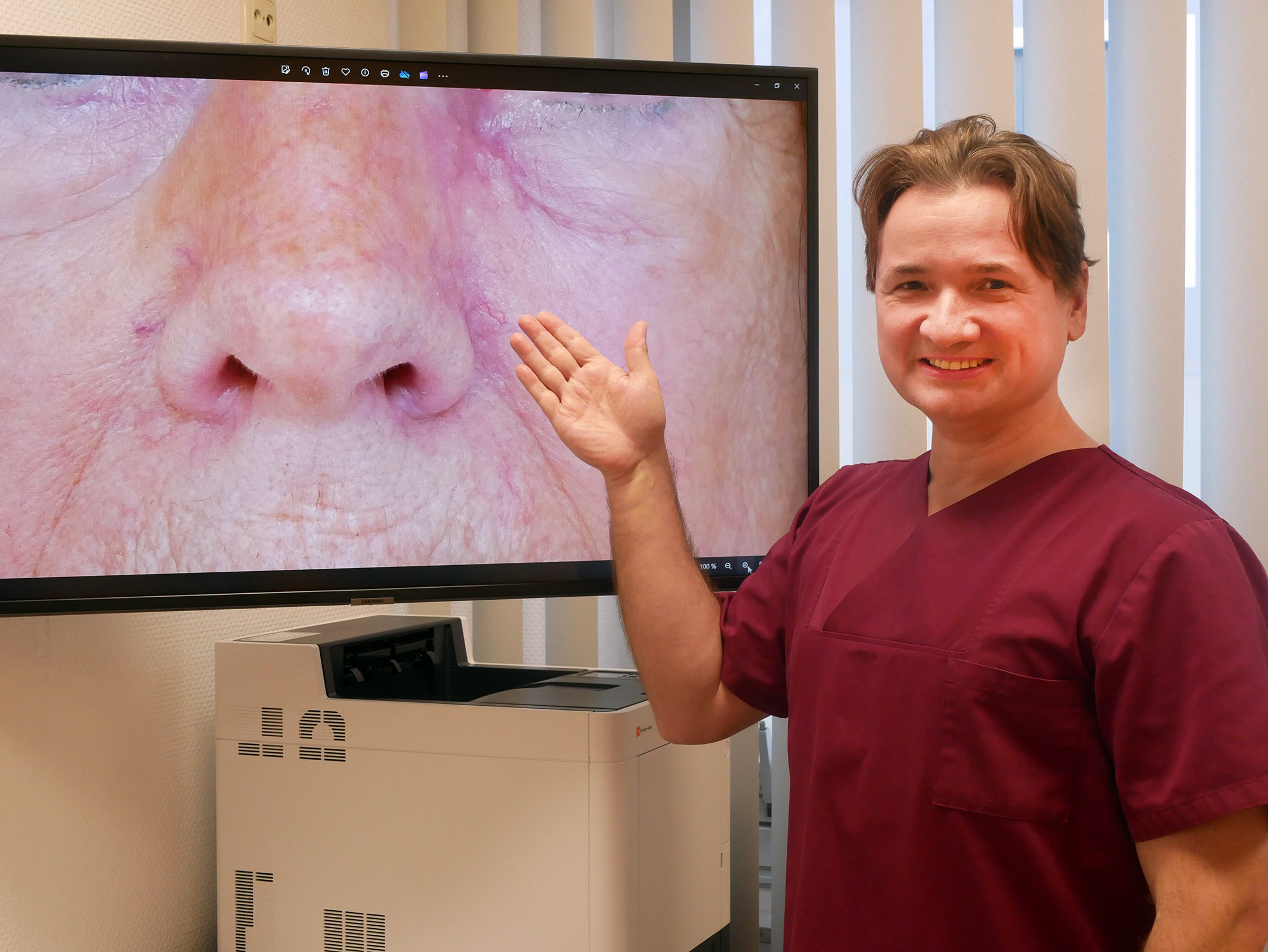 Ein „juckender Pickel“ im Bereich der Nase und des linken Unterlids hatte sie seinerzeit dazu veranlasst, ihre Hautärztin aufzusuchen, blickt die Patientin zurück. Nach einer Probe stand fest: Der Pickel war ein Basalzellkarzinom, eine Form des weißen Hautkrebses. Die Patientin wurde wegen der Größe des Tumors und seiner nahen Lage am Auge ins Krankenhaus überwiesen, ihre Hautärztin empfahl ihr Dr. Tobias Köppe. Vier Tage verbrachte die Frau im St. Irmgardis-Krankenhaus, zweimal wurde sie während dieser Zeit operiert.