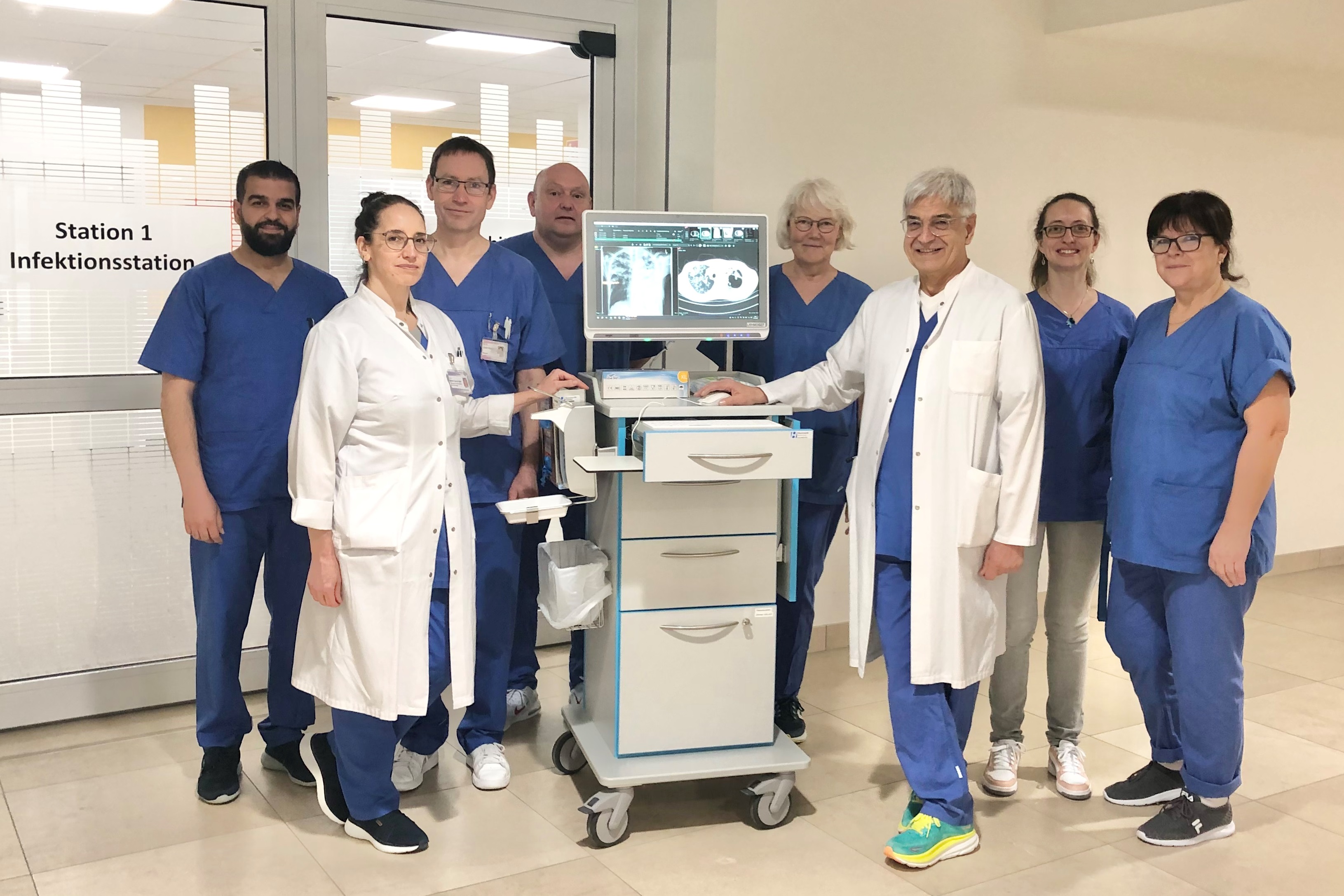 Zum Foto: „Unsere Lungenklinik verfügt über sämtliche notwendigen Ressourcen für die Diagnostik und Therapie der Tuberkulose“, zeigt sich Chefarzt Dr. med. Franz Stanzel (3. v.r.) mit seinem Team vor der Infektionsstation. (Foto: Anja Haak, DGD Lungenklinik Hemer)