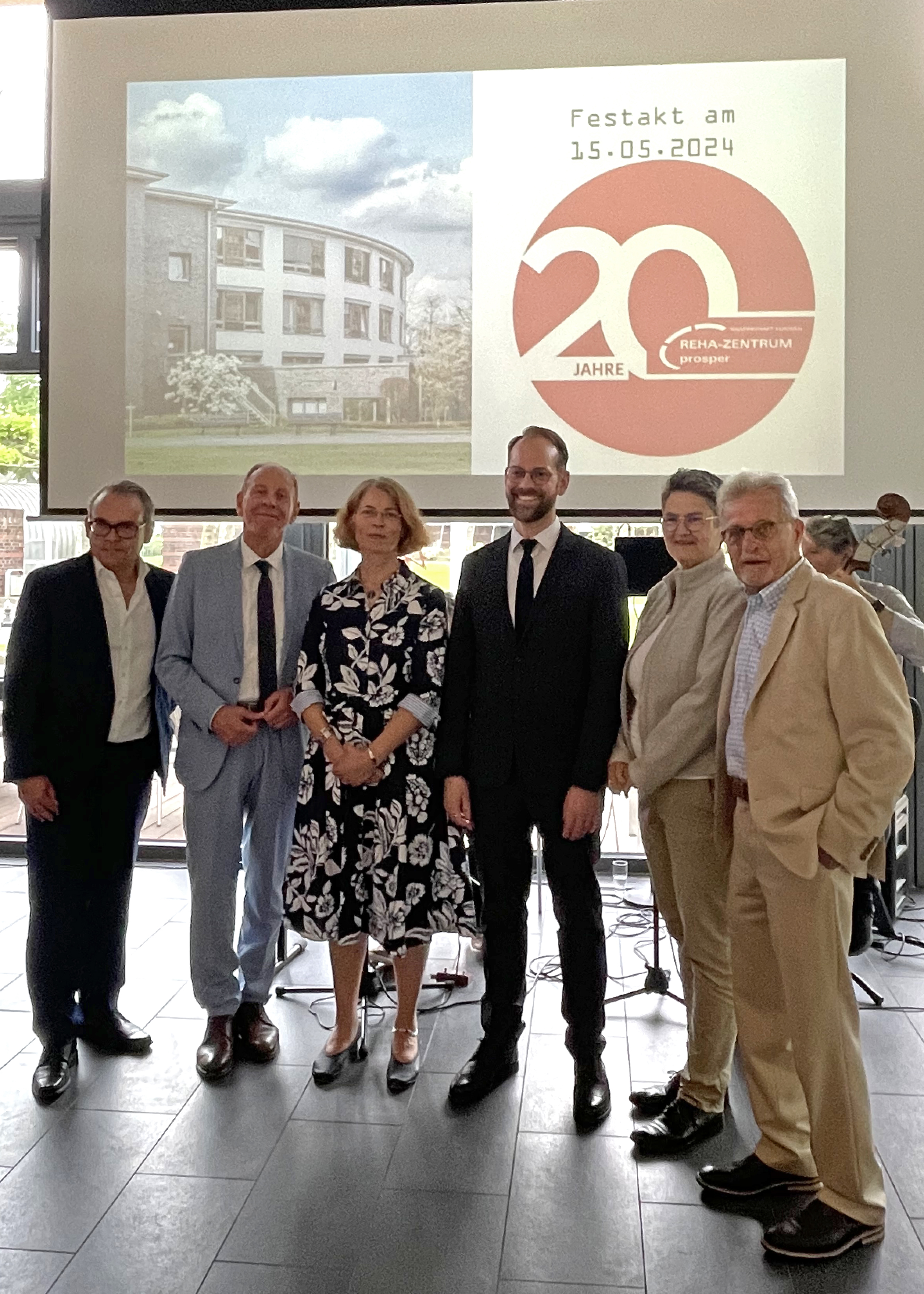 Festakt zum 20-jährigen Jubiläum des Reha-zentrums prosper (v.l.n.r.): Stefan Grave (Geschäftsführer), Bernd Tischler (Oberbürgermeister), Stefanie Josten (ärztliche Leiterin Reha-Zentrum prosper), Prof. Dr. Carsten Eggers (Chefarzt der Klinik für Neurologie, Ärztlicher Direktor des Neurozentrums), Dr. Corina Kiesewalter (ehemalige ärztliche Leiterin Reha-Zentrum prosper) und Dr. Reiner Kornblum (Chefarzt a. D. und Mitbegründer der Reha-Klinik)