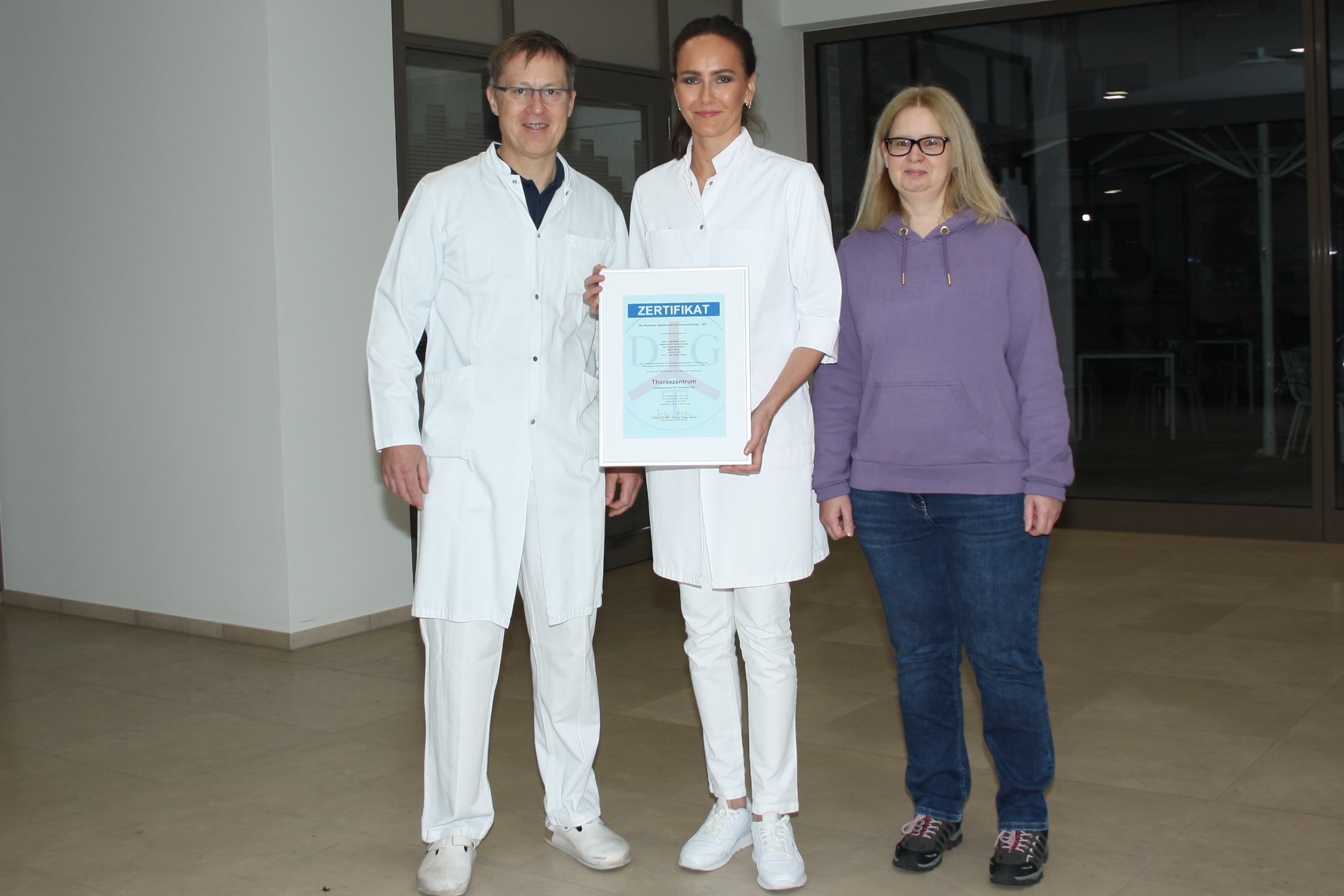 Zum Foto: Stellvertretend für das Team der DGD Lungenklinik Hemer präsentieren (v.l.) PD Dr. Stefan Welter (Chefarzt Thoraxchirurgie), MU Dr. Lucia Cordes (Oberärztin Thoraxchirurgie), Tanja Porst (Sekretariat Thoraxchirurgische Ambulanz) das Zertifikat und freuen sich über die hervorragend gelungene Re-Zertifizierung als Exzellenzzentrum für Thoraxchirurgie (Foto: Anja Haak, DGD Lungenklinik Hemer)