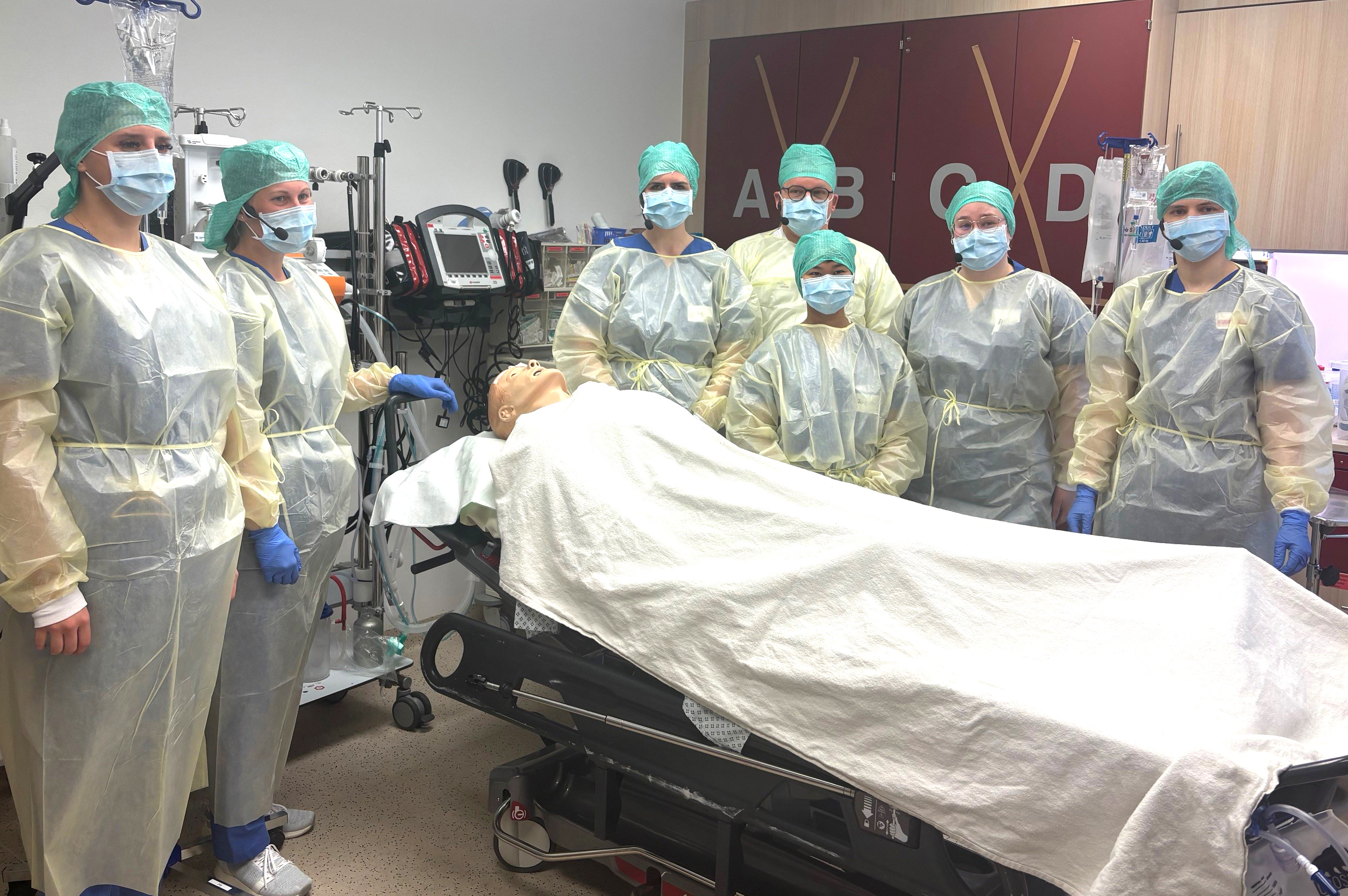 © Ein Schockraumteam der Knappschaft Kliniken Gelsenkirchen-Buer vor einer Trainingseinheit mit der Simulationspuppe (Foto: Knappschaft Kliniken Gelsenkirchen-Buer GmbH)