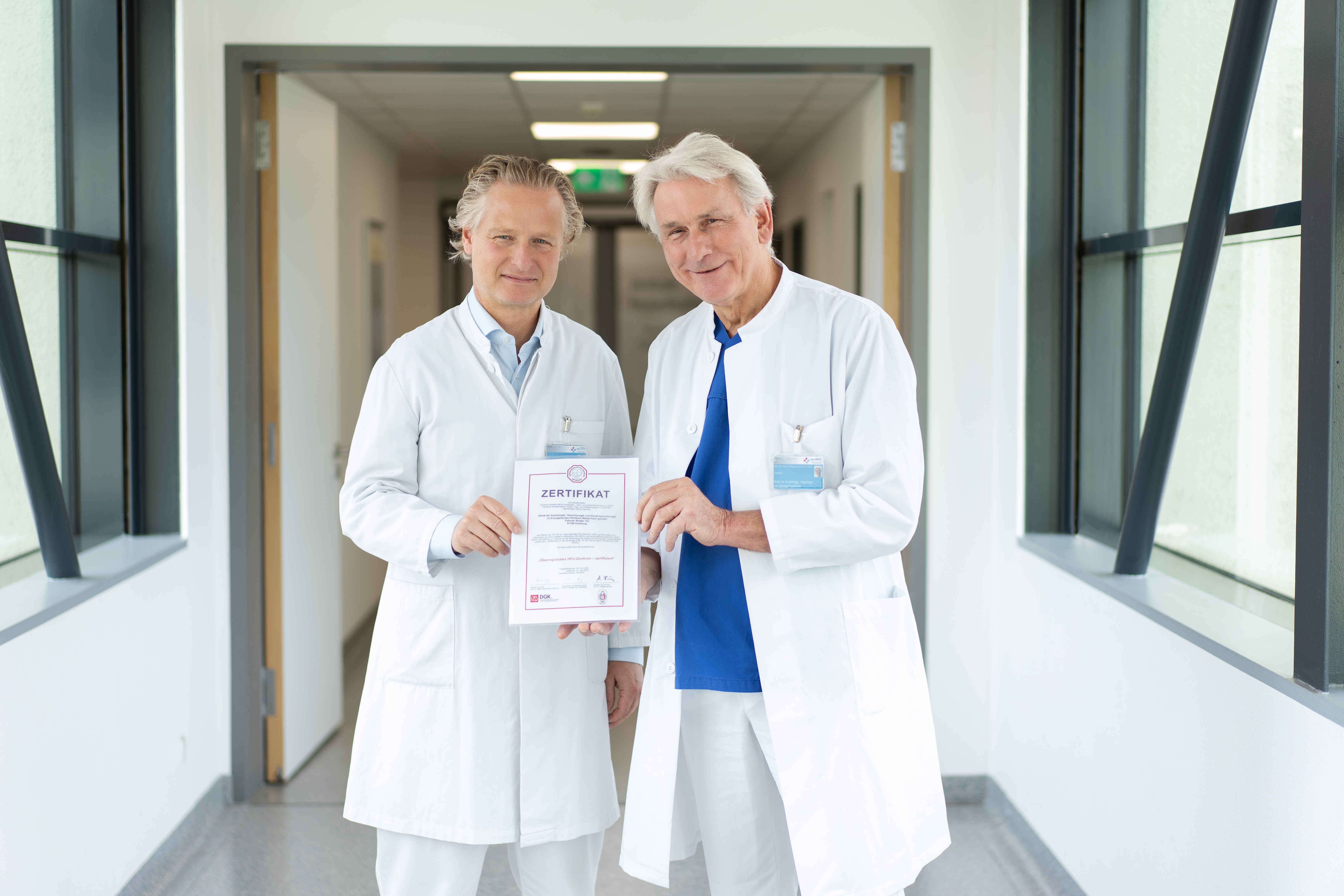 Bildunterschrift: Die Chefärzte Prof. Dr. med. Jochen Börgermann (links) und Prof. Dr. med. Wolfgang Schöls (rechts) präsentieren stolz das Zertifikat zur erfolgreichen Re-Zertifizierung.