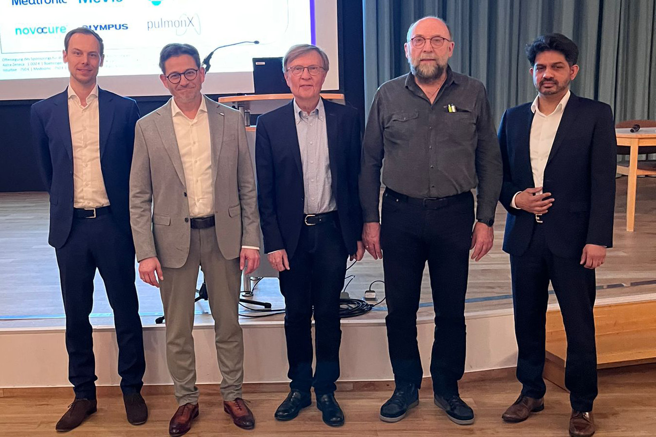 Zum Foto: Zum „Symposium Lungenkrebsscreening“ begrüßte Prof. Dr. Darwiche neben den klinikinternen Fachexperten auch hochkaratige externe Referenten; v.l. PD Dr. med. Marcel Opitz (Bereichsoberarzt, Institut für Diagnostische und Interventionelle Neuroradiologie Essen), Prof. Dr. med. Kaid Darwiche (Chefarzt der Pneumologie, DGD Lungenklinik Hemer), PD Dr. med. Michael Westhoff (Ärztlicher Direktor, DGD Lungenklinik Hemer), Dr. med. Peter Bach (Chefarzt der Radiologie, DGD Lungenklinik Hemer), PD Dr. med. Sivagurunathan Sutharsan (Oberarzt der Pneumologie, Ruhrlandklinik Essen) (Foto: DGD Lungenklinik Hemer)