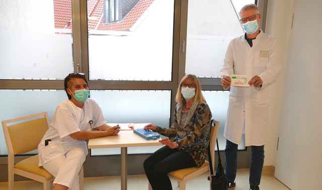 Von links: Nicole Rüssel (MS-Fachkraft), Martina Brauner (Patientin) und Prof. Dr. Thomas Postert (Chefarzt der Klinik für Neurologie). Foto: St. Vincenz-Krankenhaus/Hoppe